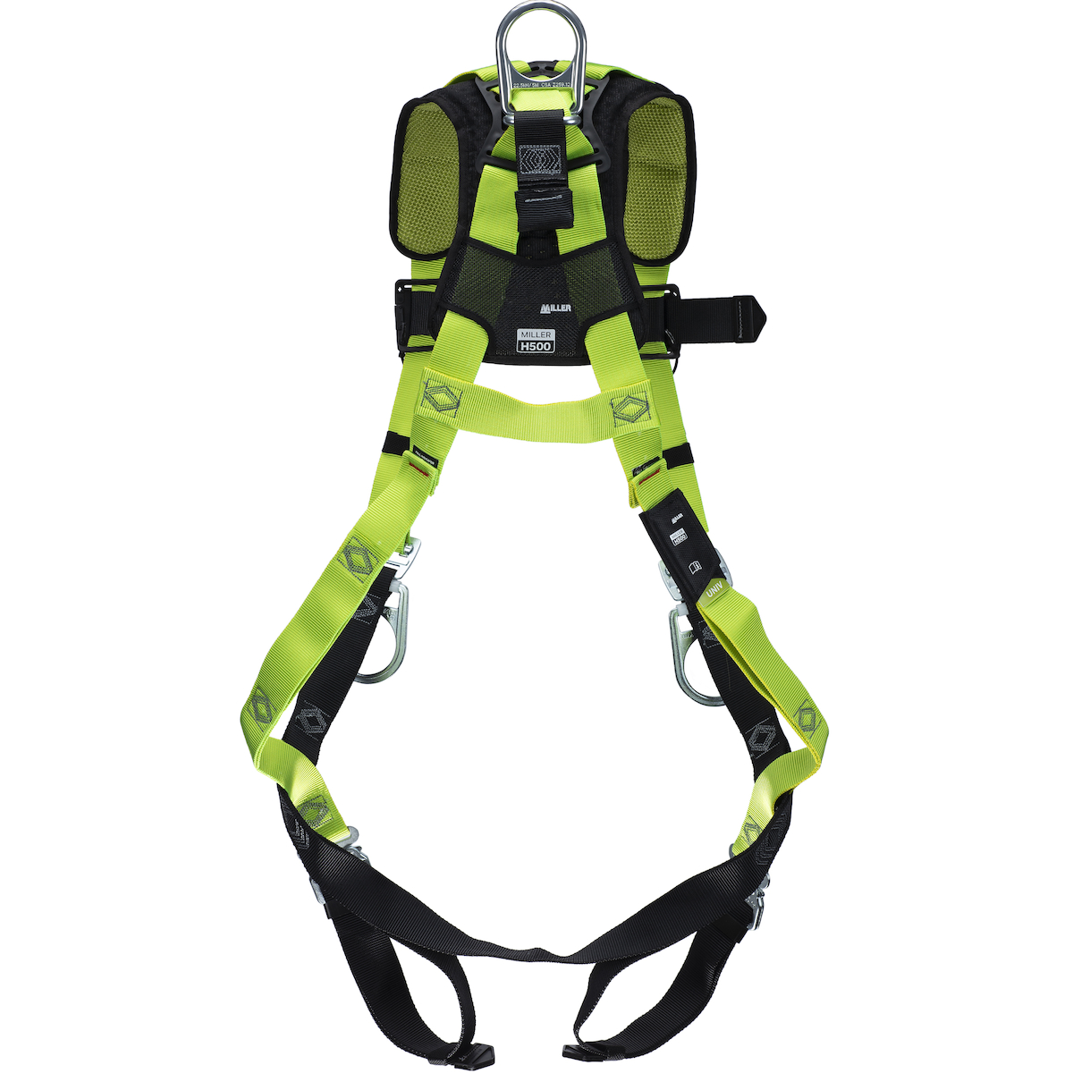 Our H500 series harness integrates evidence-based "best-in-class" anatomically and ergonomically designed pressure-relief paddings for more comfort and freedom of movement, and introduces a variety of other new smart and intuitive safety features beyond basic compliance. It features breathable shoulder and back padding, specially formulated leg and shoulder webbing, and user-friendly lanyard keepers. With quick-connect buckles and a lightweight aluminum D-rings, this harness ensures hassle-free donning. It meets OSHA 1926.502, ANSI Z359.11, and CSA Z259.10 standards, supporting up to 420 lbs.