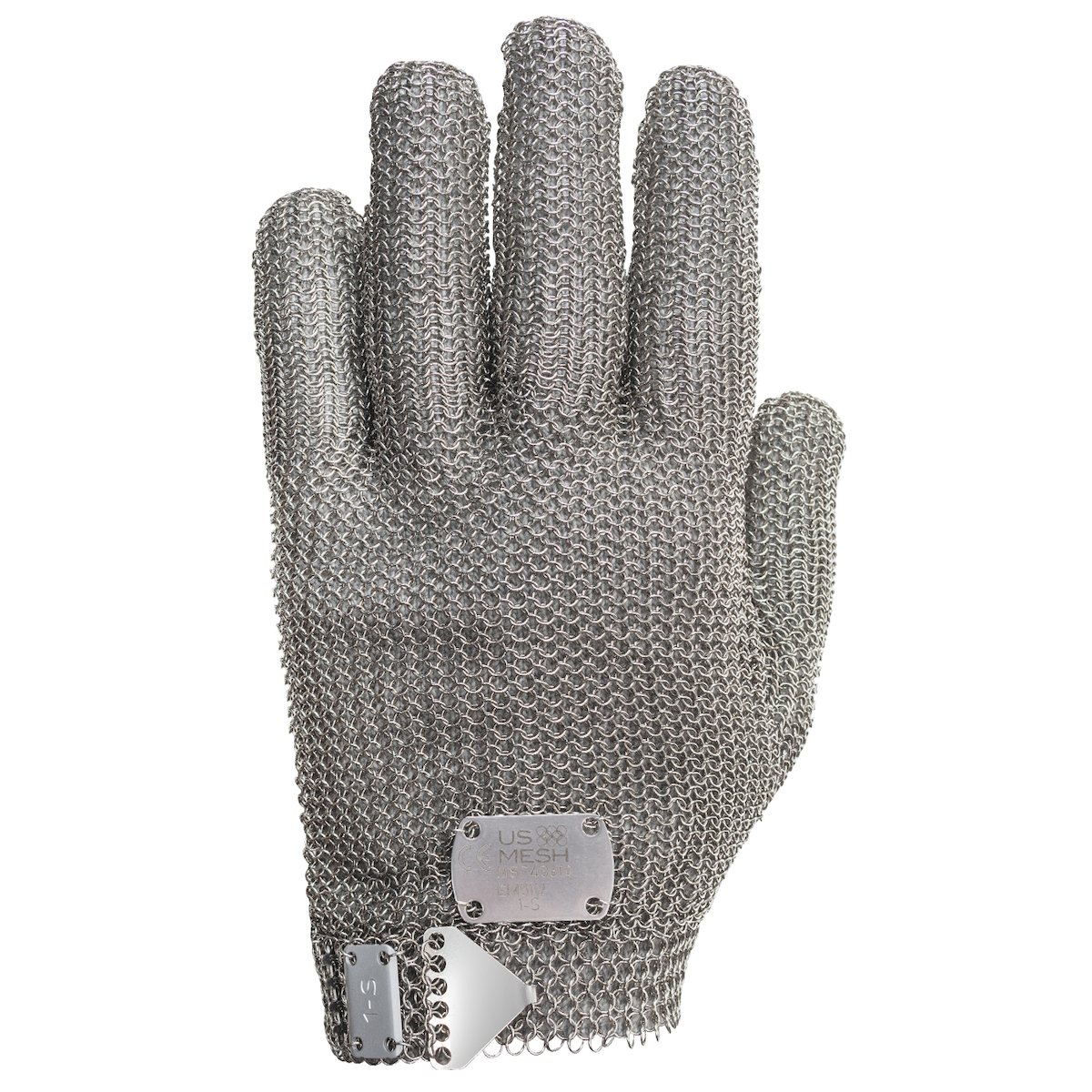 El guante de malla de acero inoxidable USM-1180 es 100% metálico, que muchos eligen por sus fortalezas de saneamiento y seguridad alimentaria. Está hecho de acero inoxidable de grado quirúrgico y ofrece un alto nivel de protección contra cortes y pinchazos. En la muñeca, un gancho de metal con púa de acero ofrece un ajuste cómodo y totalmente ajustable.